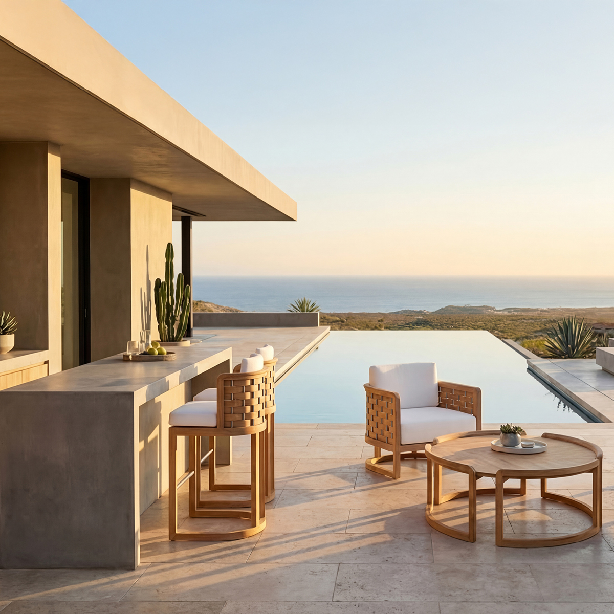 Place an order or inquireInspired by the vastness of the sea and sky, the Arc Collection embodies the perfect blend of storytelling, meticulous attention to detail, and design excellence. This range of outdoor furniture showcases the artistry of laminated teak, intricately woven between brushed stainless-steel rods that gently arc around the seats.