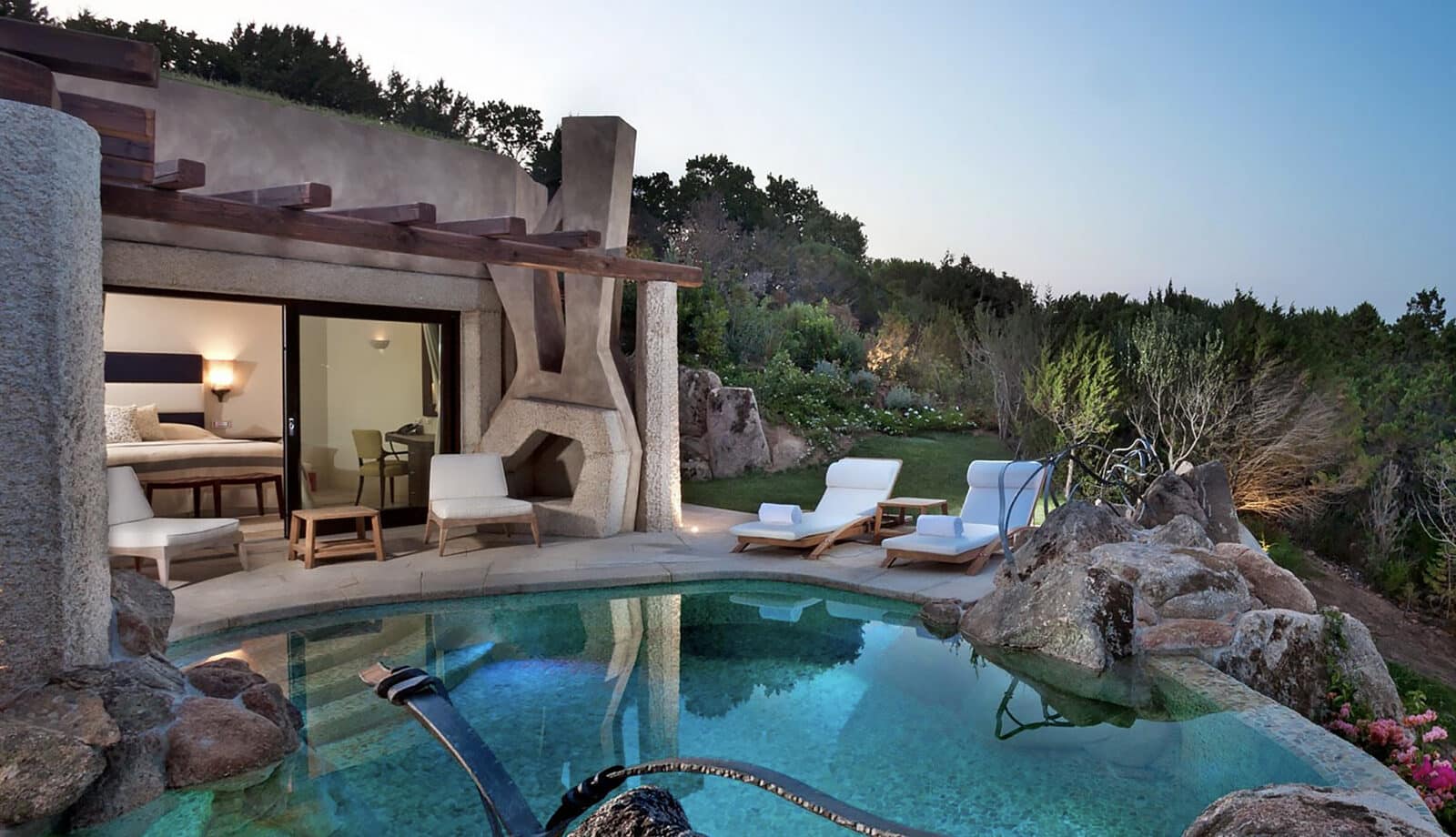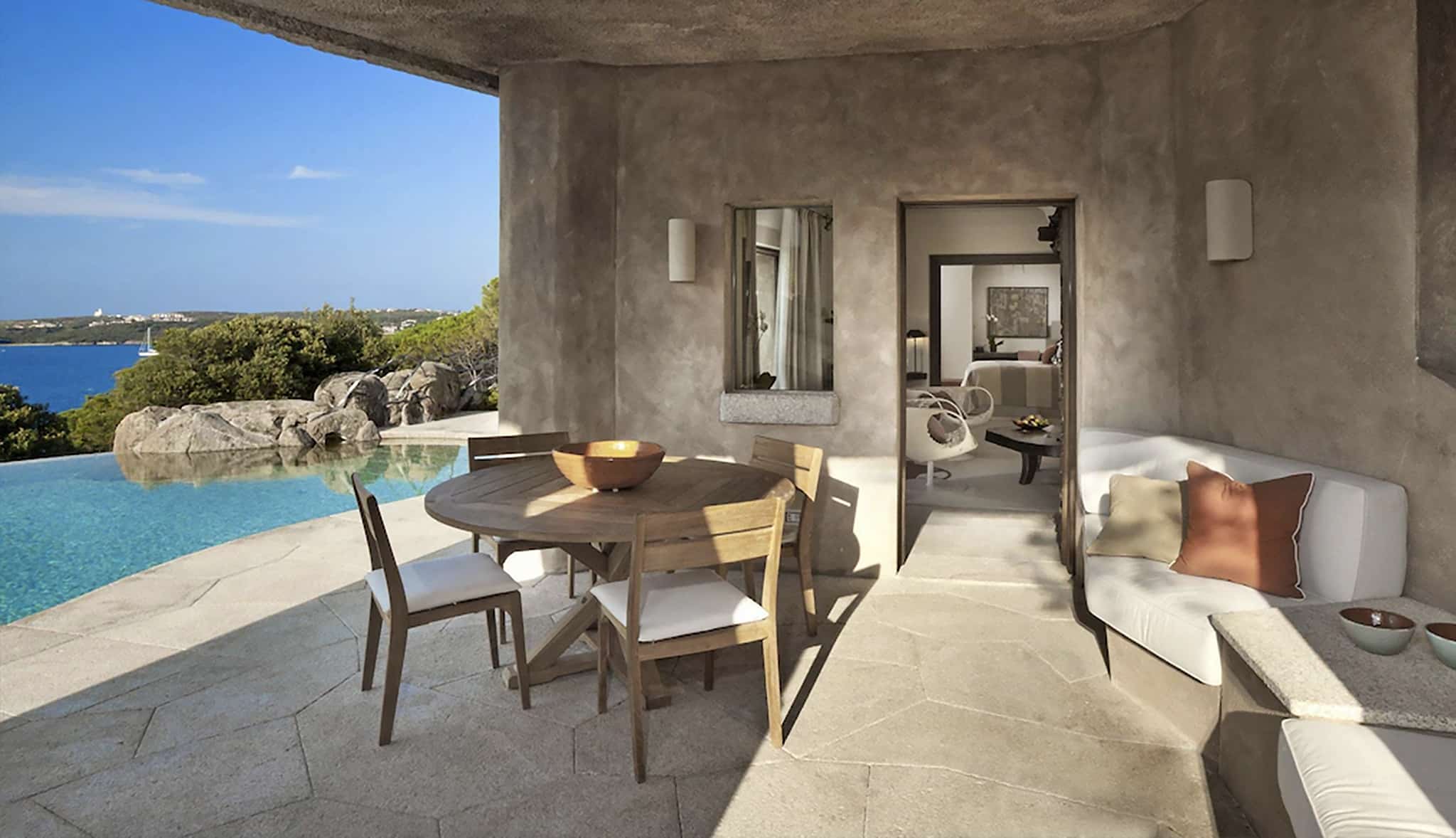 Hotel Pitrizza, Vietti’s intimate masterpiece on the bay of Liscia di Vacca, embodies this philosophy in its purest form. Its villas are scattered across the rocky headland like a cluster of ancient stone houses, connected by garden paths and framed by hibiscus, olive, and juniper. The hotel’s famed swimming pool is carved directly from Sardinian granite, its edge dissolving into the sea beyond. On its terraces, Summit furniture furnishes the outdoor spaces where guests dine and lounge against a backdrop of crystalline water and weathered stone. It belongs here as naturally as the granite beneath it.