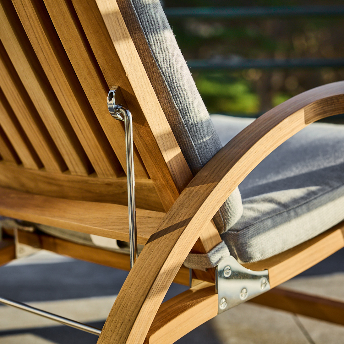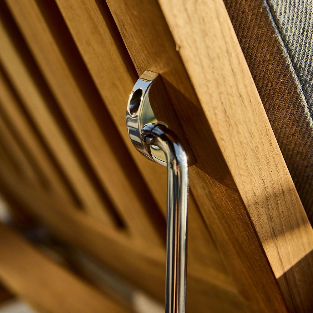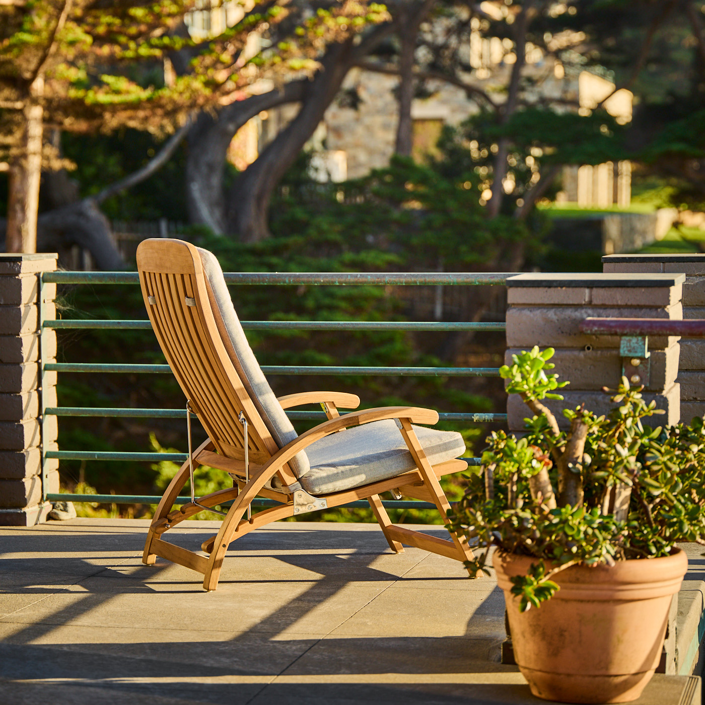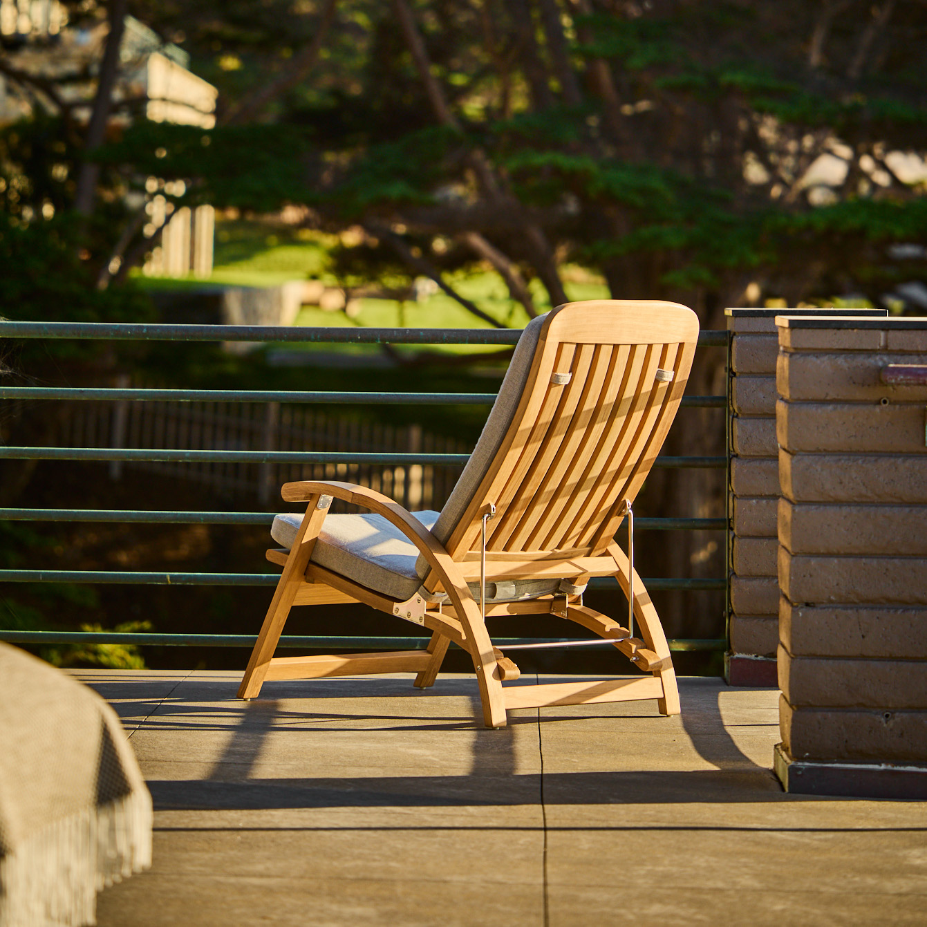 Folding, adjustable recliner in plantation-grown teak with marine-grade stainless-steel fittings. Seat and back cushions included.